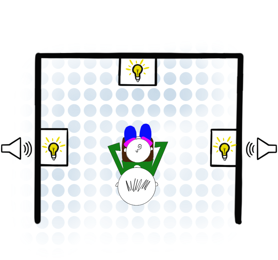 In this procedure, the infant sits on a caregiver’s lap or in a highchair, and sees a light/computer screen directly in front and at 90 degree angles to the right and left. When the infant looks to one of the side screens/lights, we play an auditory or audio-visual stimulus for as long as the infant is interested. When the infant gets bored, we turn that stimulus off, and wait for the infant to look to the other side. Once the baby looks, we start playing another stimulus. We create stimuli that we think will be more or less interesting to infants, and then see if that prediction matches how long (on average) babies are interested in listening/watching the different stimulus types.